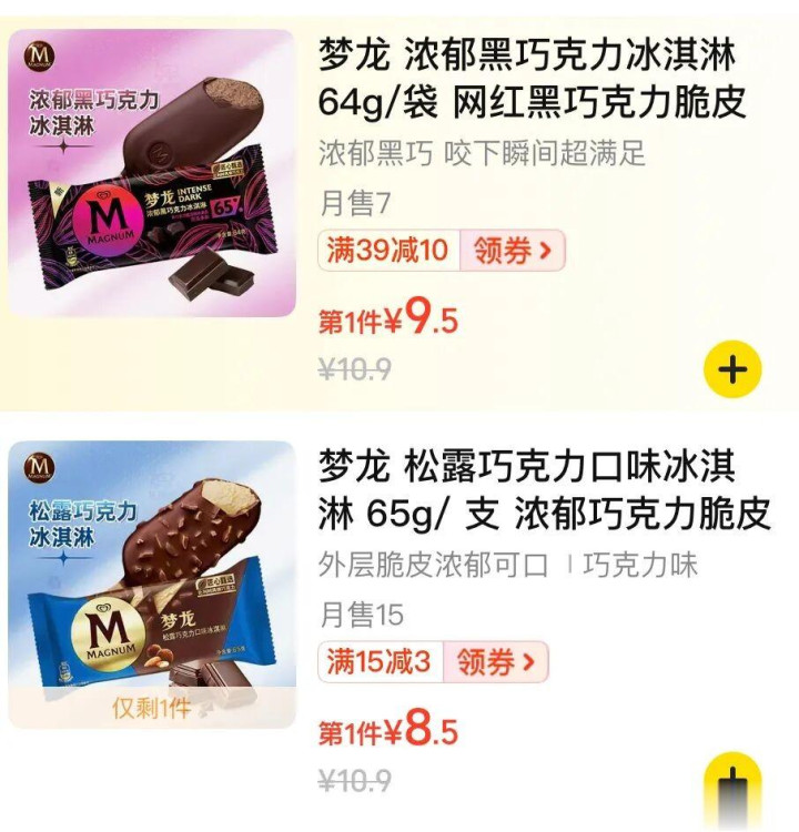 梦龙在中国坚持高端化战略,2025 年初推出的醇巧筒冰淇淋,单支售价 29.9 元,甜酒风味布朗尼蛋糕冰淇淋两支装售价 39.9 元。2023 年推出的迷你梦龙,虽克重从 65 克减至 42 克左右,但凭借精致定位,一度占据京东棒支冰淇淋热卖榜榜首。
