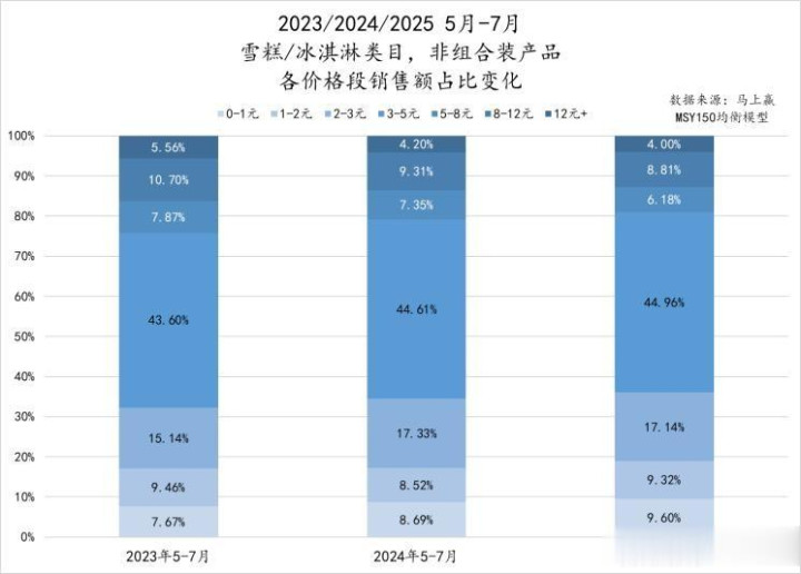 更现实的问题是,中国消费者更偏爱大众价格带冰淇淋。马上赢数据显示,2025 年 5-7 月,0-8 元价格带产品占行业整体销售额超 80%,而 8 元以上高端价格带占比持续缩小。
